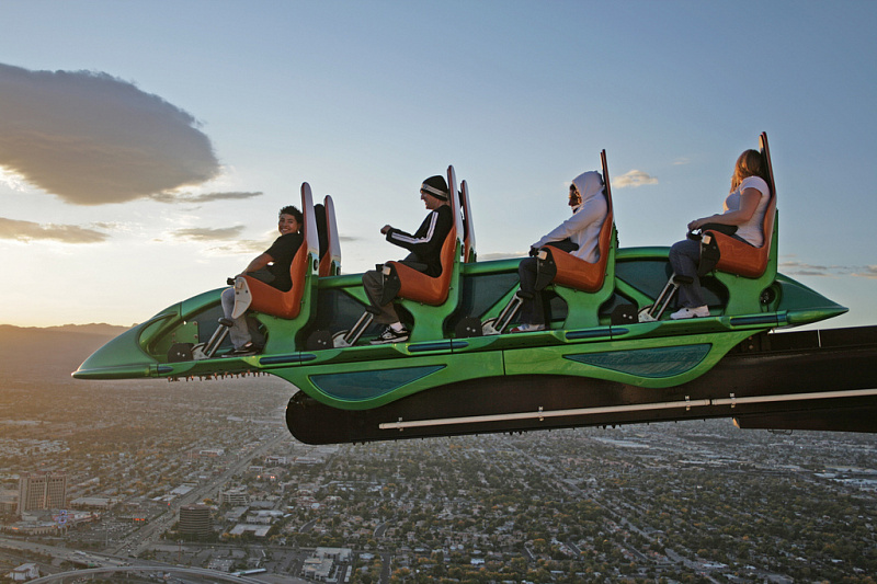 Начать стоит с обзорной башни отеля-казино «Стратосфера Лас-Вегас». Там располагается комплекс «Над крышей мира», состоящий из трех знаменитых аттракционов. Прокатиться хотя бы на одном из них сможет только настоящий смельчак.