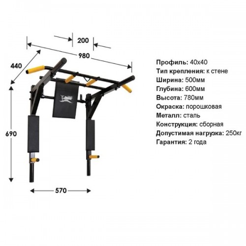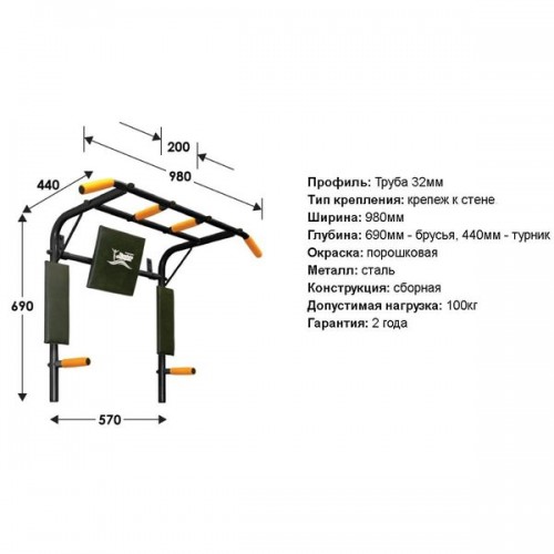 Тренажер представляет из себя Г-образную стальную конструкцию. Одна сторона этой конструкции выполняет роль турника, а другая сторона – роль брусьев и стойки для пресса.
