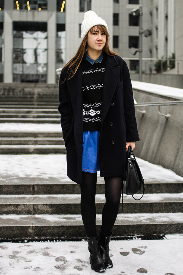 .Зимние наряды 2015: на Аличье пальто от Sisley, черная водолазка от Stradivarius, подходящая юбка от Zara, шапка от Bershka, ботильоны от Prima Moda и сумка от Guess