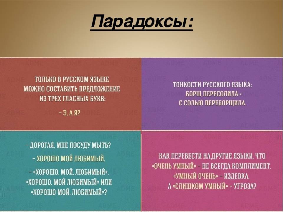 Парадокс — высказывание, которое расходится с общепринятым мнением и кажется нелогичным (зачастую лишь при поверхностном понимании). Парадокс, в отличие от афоризма, поражает неожиданностью. Например, уайльдовский «Разводы совершаются на небесах». Парадокс — это всегда полуправда и это, как говорил Оскар Уайльд, «лучшее, чего мы можем достичь, потому что абсолютных правд не существует». Парадокс своей стилизованной формой напоминает афоризм. В парадоксе привычная истина рушится на глазах и даже высмеивается. Например, «Я слышал столько клеветы в Ваш адрес, что у меня нет сомнений: Вы — прекрасный человек!» (О. Уайльд), «Взаимное непонимание — самая подходящая основа для брака» (О. Уайльд).