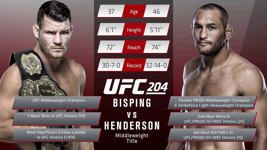Майкл Биспинг впервые попытается защитить свой титул в среднем весе, когда он сразится со старым противником Дэном Хендерсоном 8 октября на турнире UFC 204. и, как известно, закончился тем, что Хендерсон нанес сокрушительный нокаутирующий удар, за которым последовал академический удар своему бессознательному противнику.