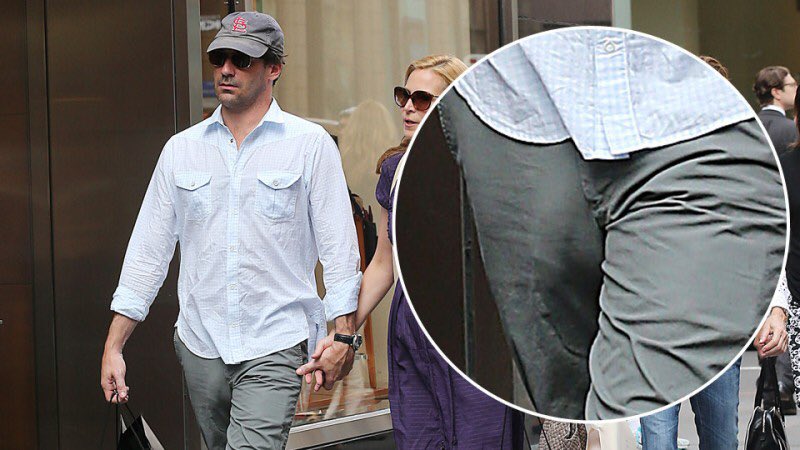 Все дело в том, что однажды актер Джон Хэмм вышел на прогулку в чрезмерно обтягивающих брюках (на фотографии актер вместе с женой, актрисой и сценаристом Дженнифер Уэстфелдт), и папарацци удалось сфотографировать его мужской половой орган, который хорошо просматривался сквозь ткань брюк.