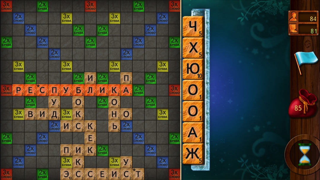 На середину игрового поля выкладывается первое слово, затем следующий игрок может добавить слово «на пересечение» из своих букв. Слова выкладываются либо слева направо, либо сверху вниз.Словарь