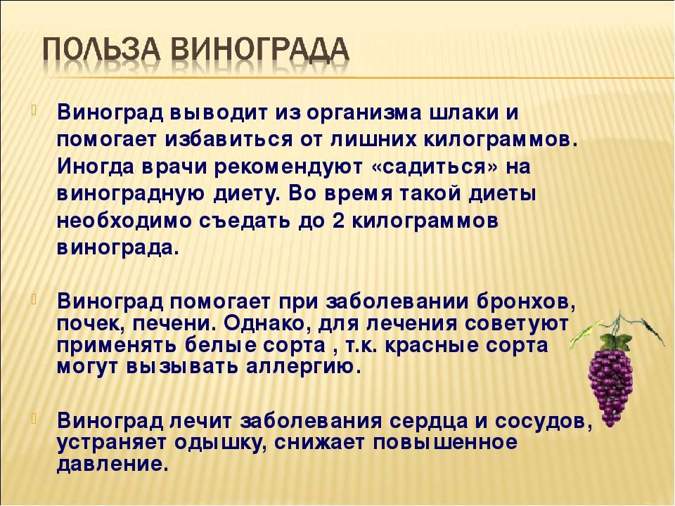 По ее словам, одними из самых полезных считаются черные и красные сорта винограда. Ягоды нормализуют давление и будут очень полезны людям с заболеваниями сердечно-сосудистой системы.Кроме того, виноград славится своими антиоксидантными свойствами. Он помогает организму блокировать процесс разрушения клеток и тканей, а также способствует его очищению от токсинов и шлаков. В этих компонентах лучше всего проявляет себя виноград темного цвета.В винограде содержатся треть дневной нормы витамина C, необходимого для поддержания иммунной системы, витамины группы В, играющие важную роль в разгоне метаболизма. А это крайне важно — при хорошем обмене веществ у человека нормализуется вес. Также перечисленные витамины положительно воздействуют на нервные клетки, повышая стрессоустойчивость организма. Как следствие человек спокойнее воспринимает информацию и лучше запоминает ее.Виноград — сладкая ягода, но она практически не влияет на повышение уровня сахара в крови. У нее низкий гликемический индекс, поэтому можно без опасений есть довольно большое количество винограда без риска развития диабета.