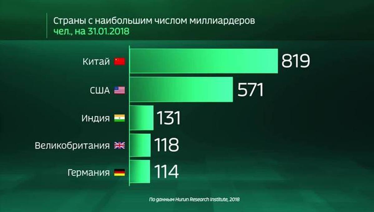 Лидером по числу миллиардеров стал Китай. Здесь проживает 799 миллиардеров. Китай отличается сильной экономикой, а в последние десятилетия здесь наблюдаются высокие показатели экономического роста.