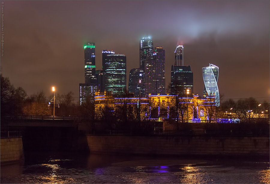 Пейзаж оживляют проплывающие мимо теплоходы и катера, украшенные яркой вечерней подсветкой.