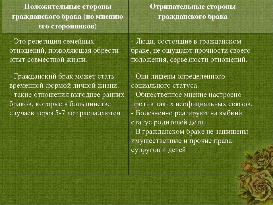 «Минусов» у гражданского брака набирается больше, чем «плюсов». И причина этому — специфические особенности гражданского брака, которые зависят от законодательства страны, уровня обеспеченности человека, наличия своего жилья и многого другого.1. Отсутствие равноправия. Поскольку мужчины и женщины по-разному относятся к этому браку, свои обязательства они также выполняют неодинаково. В большинстве случаев партнерша полноправно берет на себя роль замужней женщины, а мужчина продолжает вести холостяцкий образ жизни. Для него это становится настолько удобным и комфортным, что через какое-то время он вообще не захочет изменять эту форму отношений на какую-либо другую.