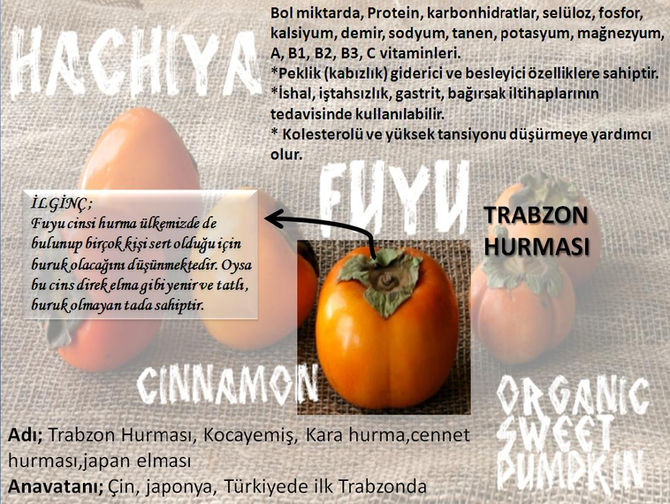 У них глянцевая темно-оранжево-красная кожура и темно-желтая мякоть с черными прожилками. У них мало или совсем нет семян. - Fuyu: Этот вид хурмы имеет форму томата и не терпкий, поэтому человек может есть ее, когда она еще твердая или недозрелая. Их кожа темно-оранжевая, а мякоть светло-оранжевая. У них мало или совсем нет семян.