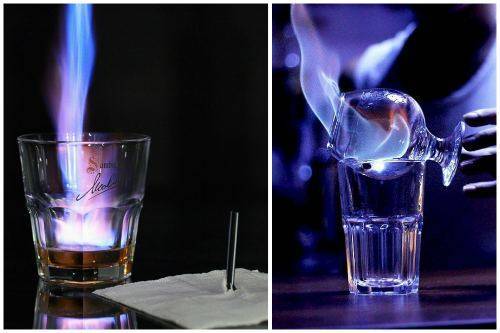 | Вылейте горящее содержимое в стакан олд-фешенд, накройте вторым бокалом, огонь потухнет. Пары поднимаются вверх, на дно опрокинутого бокала. | |