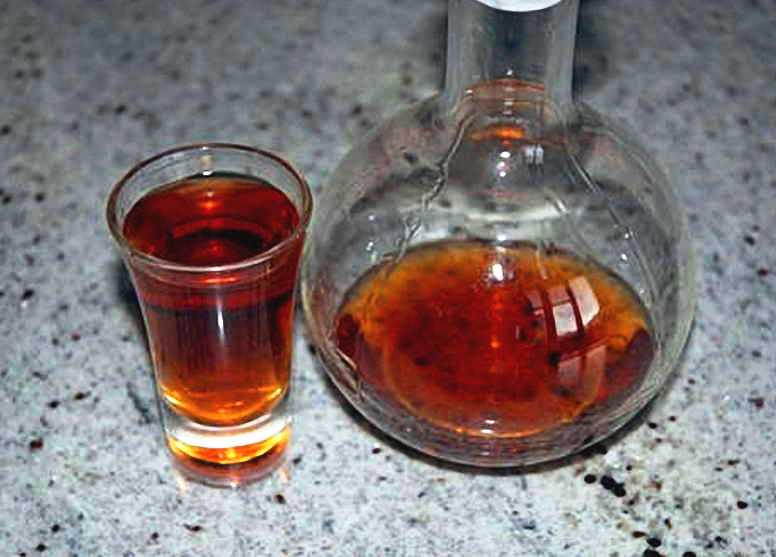 Следующим этапом добавляются специи, сахар, ягоды и заливается водкой крепостью 40–45 оборотов. Если у горячительного напитка градусы превышают допустимую норму, то необходимо разбавить бутилированной водой.