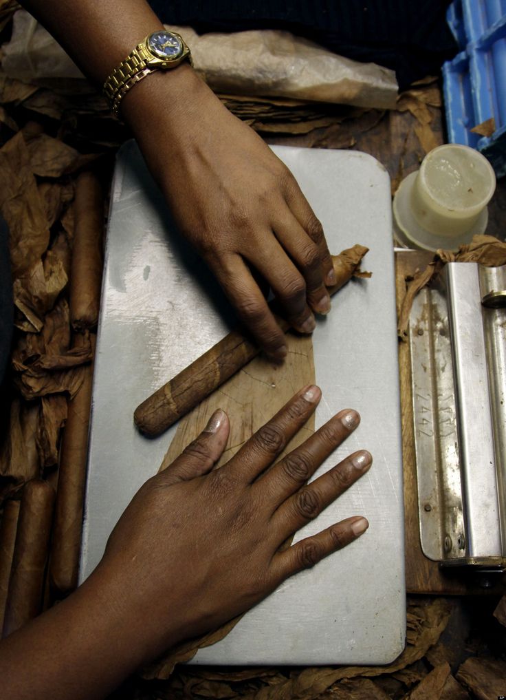 В огромном помещении сидят несколько сотен человек, в основном молодые мужчины и женщины, и на специальных столах крутят сигары.