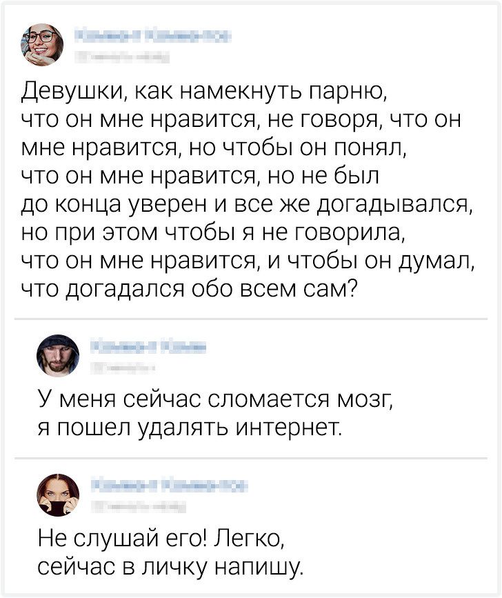 Мужчине, который думает, что он остряк, очень важно получить лавры Гарика Харламова в своём окружении, а ты можешь дать ему эти лавры, смеясь над его шутками.