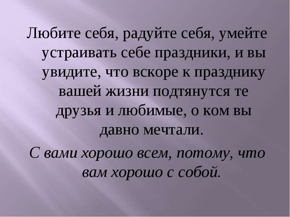- благодарите жизнь за все хорошее, что она вам дала – сейчас, на прошлой неделе, в далеком детстве: за каждый день жизни, за поющих за окном птиц, за возможность читать эти строки своими глазами, за живых и здоровых родителей, за свет и душевное тепло, поддержку тех, кто дорог.