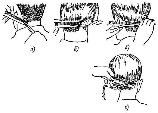 область снижу от центральной части затылка подстригают машинкой с короткой насадкой, например, «единичкой»;