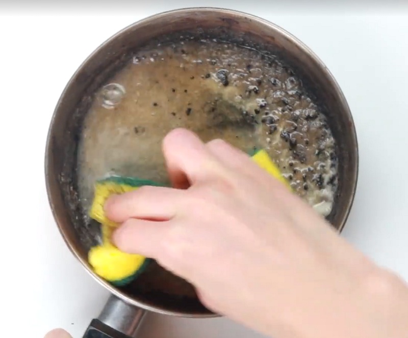 Для еды, пригоревшей на эмали, можно довести до кипения 2 стакана воды и 4 столовые ложки пищевой соды.Вам нужно прокипятить эту смесь всего пару минут.