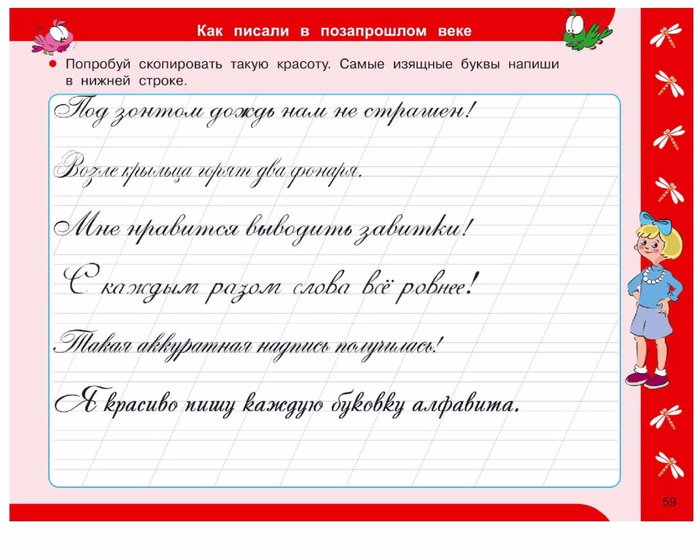 Безупречная каллиграфия возможно только при регулярных и систематических уроках. Для этого на помощь спешит пропись. Для дополнительных занятий можно купить прописи, которые используются в школе, а можно выбрать другие — в виде забавных зверюшек и веселых картинок. Дошкольникам и первоклассникам полезно выполнять штриховку, обводку и рисование по клеточкам. Для отработки каллиграфического почерка детям 2-4 классов рекомендуется выполнять упражнения на списывание. Возьмите любой текст из учебника или книги и попросите ребенка аккуратно переписать его в тетрадь.