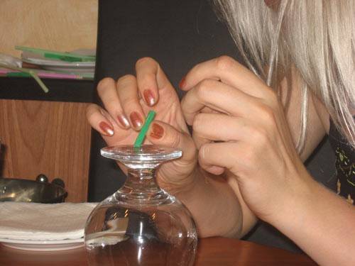 Сначала поставьте перед собой стакан, из которого потом будете пить коктейль, рядом положите салфетку, а на нее трубочку.