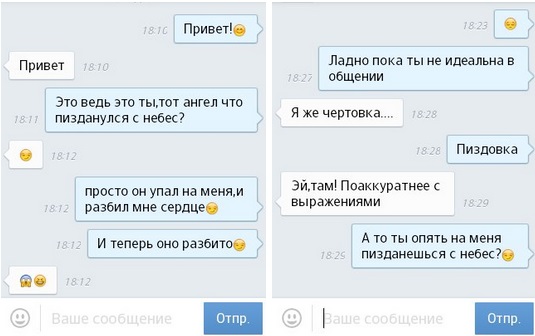 - Кажется, я нашёл девушку с одной из самых очаровательных улыбок в мире. Поверишь, что я обладатель одной из самых лучших версий чувства юмора, или доказать? 🙂