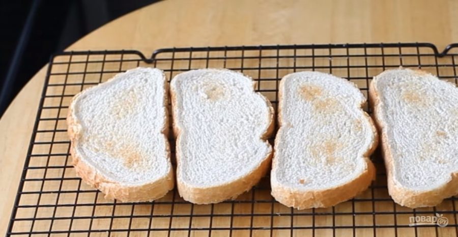- Хлеб нарезать вдоль довольно тонкими большими прямоугольниками. Подсушить в тостере, в духовке или на гриле.