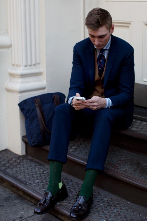 То есть просто удостоверьтесь, что носки не являются чем-то чужеродным на фоне всего остального ансамбля, вот и весь секрет. Подробнее о цветных мужских носках.