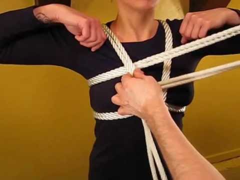 После чего веревка идет через левое плечо, опоясывает грудь и доходит до правого запястья. Главное здесь — посильнее натянуть веревку, чтобы зафиксировать положение руки. Далее она огибает правую руку и ведется в обратную сторону, вплотную к предыдущему витку. Веревка приходит к левому запястью и аналогично крепится там. Операция повторяется еще несколько раз, затем веревка закрепляется узлом на правой руке.