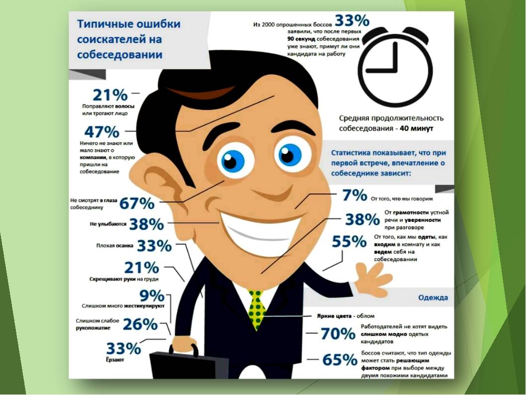 Существует мнение, что это лучшее время для интервьюера: он расслаблен, уже успел выпить кофе, его неделя распланирована, но он еще не устал от дел рабочих. А кандидатам это только на руку. Поэтому, если эйчар предоставляет вам определенную гибкость в выборе времени для собеседования, предложите вторник 10:30 утра.