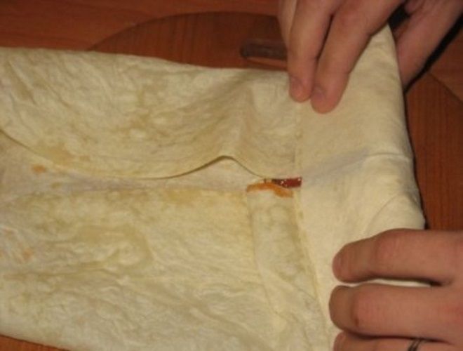 - согнуть низ лаваша, прикрыв им начинку, по направлению к центру
