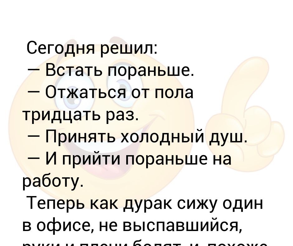 За день до утреннего подъема я был замотивирован и входновлен. Я с нетрпением ждал завтра и хотел поскорее проснуться и изменить свою жизнь. Но потом прозвенел будильник, я встаю, 6 утра, я очень уставший и невыспавшийся, продлеваю и продлеваю будильник, пока не наступает 8 утра.