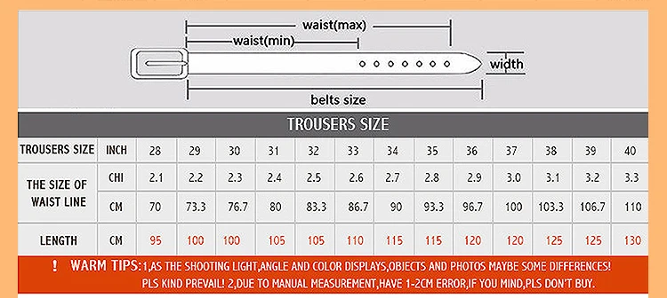 Посмотрите на таблицу размеров ниже вашего размера талии и найдите свой размер ремня! следуйте размеру брюк и выберите соответствующий размер талии.