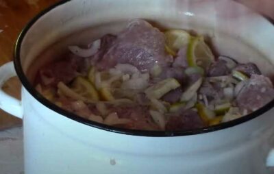 Свинину и телятину Александр Липинский рекомендует замариновать в минеральной воде: репчатый лук, нарезанный полукольцами, соль, перец по вкусу и минеральная вода.