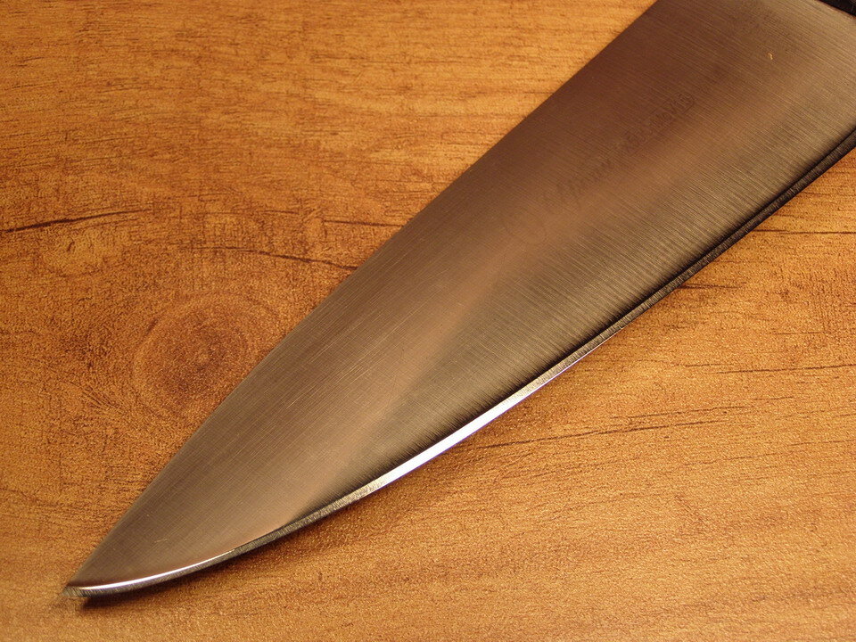 - Ножи из углеродистой стали – самые доступные по цене, изготовлены из сплава железа и углерода, легко затачиваются и долго остаются острыми. Из недостатков можно отметить, – окисление лезвия ножа от взаимодействия с пищей или кислой средой, по причине этого, на ноже появляются ржавчина и пятна, а продукты приобретают металлический привкус. Со временем, после образования на лезвии налёта, окисление прекращается.