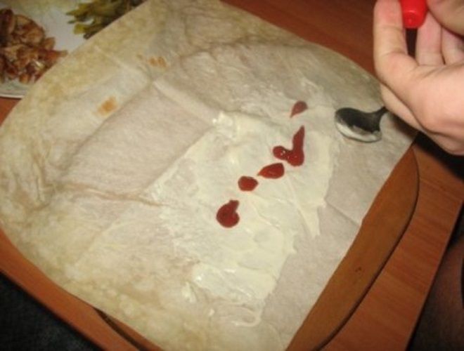 10. Теперь выкладываем лист лаваша на стол. В том случае, если лаваш у вас из холодильника, то его желательно сначала нагреть в микроволновке. Таким образом он станет более эластичным и не будет рваться в процессе скручивания.