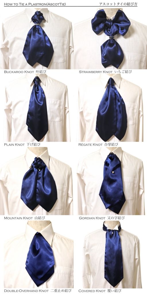 Можно предложить два варианта завязывания банта Ascot. Первый заключается в завязывании одного простого узла. Второй напоминает способ завязывания галстука Четверка, но на последнем этапе верхний конец платка нужно не продевать в петлю, а просто положить сверху получившегося узла.