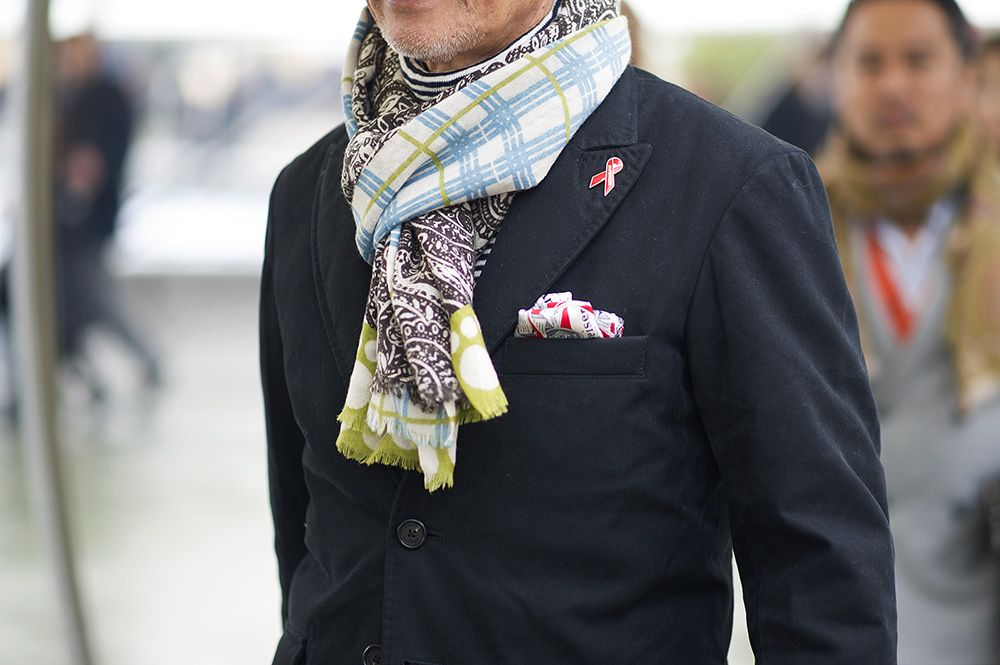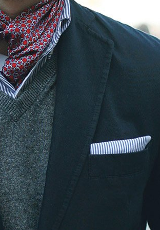 Чтобы сет выглядел завершенным, цвет мужского платка должен дублировать оттенок свитера или верхней одежды.