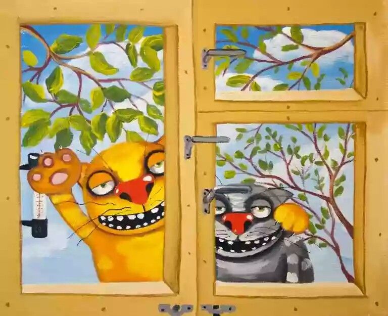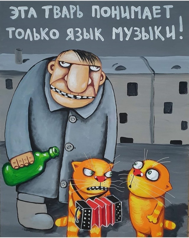 – Я поначалу делал зайцев, но продавались они не так быстро, а вот стоило нарисовать кота, как его сразу купили. Картина называлась «Кот, откушав коньяку, испытывает приятное послевкусие». Приобрела женщина из Питера. Тогда я еще сомневался, а стоит ли переходить на котиков. Попса ведь. Понятно, народ любит котиков, но наживаться на этом? Но рисовать котов приятнее, чем курьером работать. Словом, соединил приятное с полезным. Я смотрю на своих котиков как на материал для творчества типа пластилина или глины. Собаки слишком позитивные, в медведя сложно перенести какие-то человеческие эмоции, а вот кот — животное вредное и хитрое, весь спектр эмоций на морде. Лепить легче всего. Может, потому что я всю жизнь с котами, хотя и не кошатник. Дома у меня сейчас по стенам скачет абиссинец — животное чокнутое, но дико красивое и ласковое. А мои рисованные — и не котики вовсе, скорее человекообразные лемуры.
