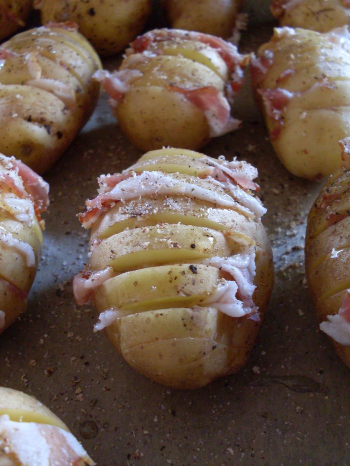 В надрезы поочередно вложить ломтики сыра и бекона. С помощью силиконовой щетки картофель обмазать оливковым маслом, предварительно смешанным с солью и травами. Выпекать при 200 градусах 25 минут.