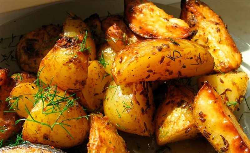 Готовая картошечка становится румяной и легко накалывается вилкой.