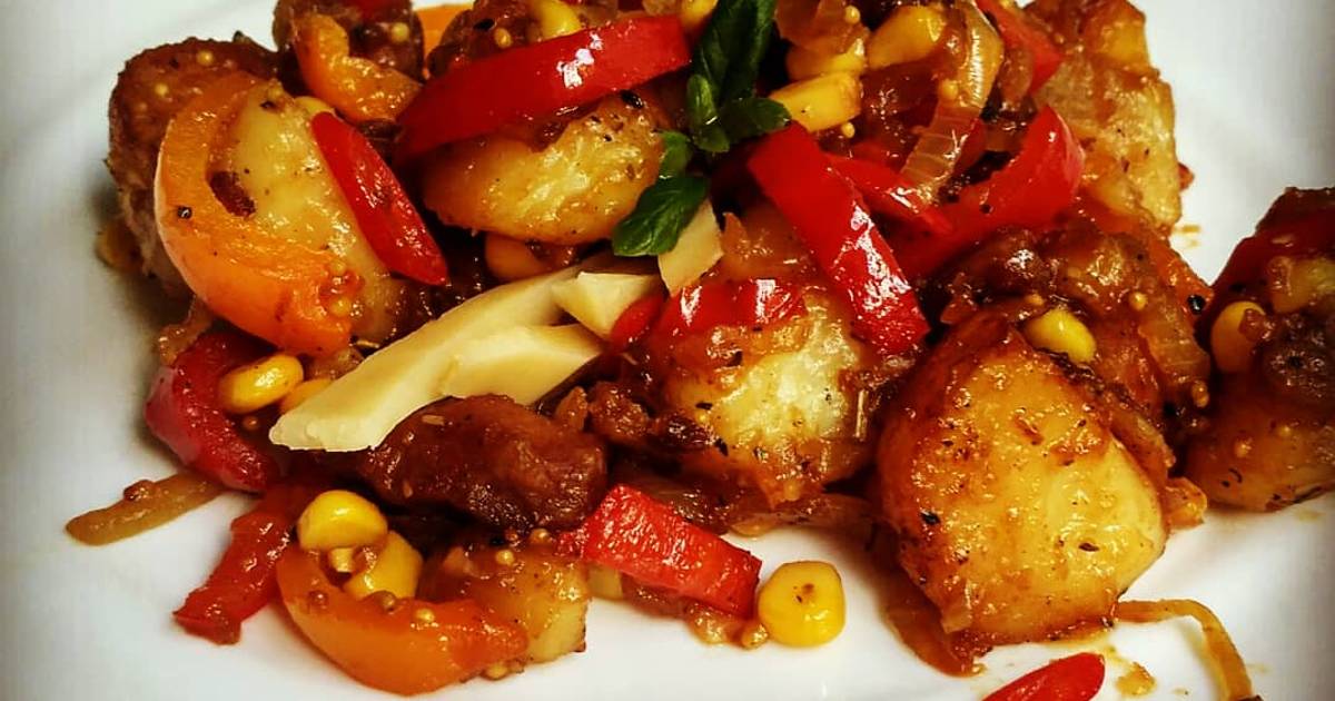 Вы также можете добавить свои любимые копченые колбаски на сковороду, чтобы приготовить полноценное блюдо! Это одно из любимых блюд моего мужа, и я тоже его люблю, потому что оно такое простое. Сосиски протыкаю вилкой и потом кладу на противень с картошкой на последние 15 минут.