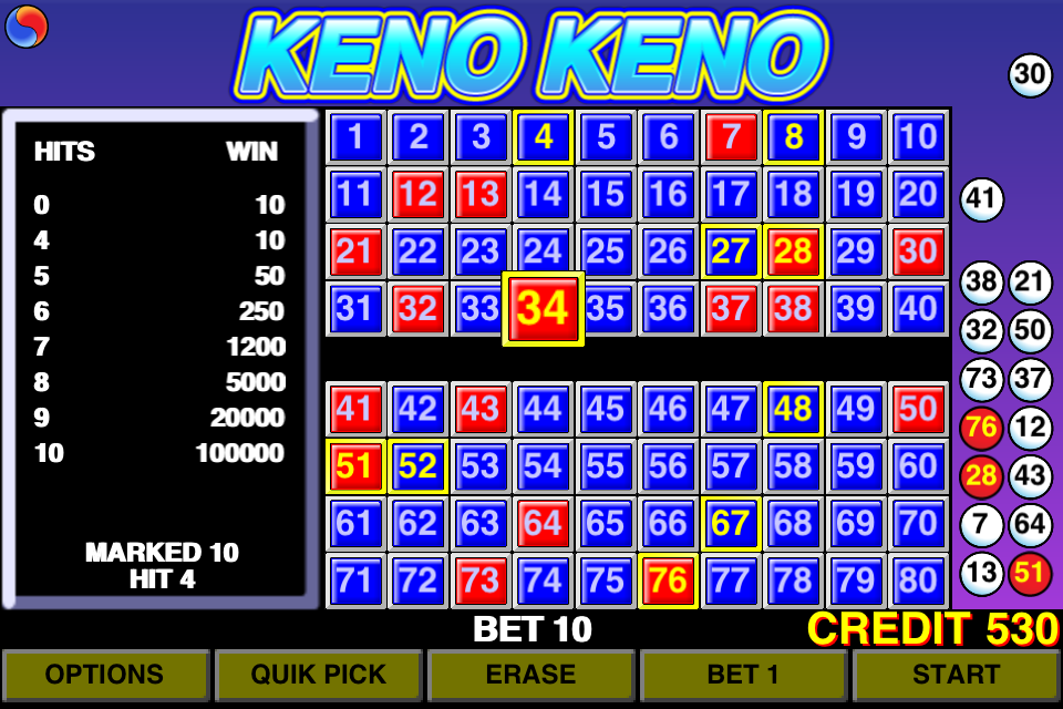 бязательно укажите на боковой части билета, на что именно Вы ставите, иначе считывающее устройство «Кено» может все перепутать. Выполнение этого вручную может показаться сложным, но, играя онлайн, Вы не испытаете никаких затруднений, поскольку все, что Вам будет нужно делать, — это нажимать кнопки.