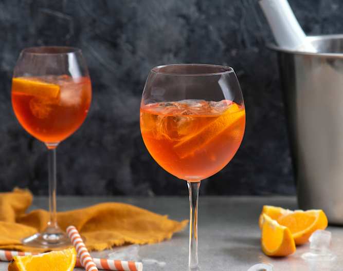 Коктейль Aperol Spritz обычно подается в большом бокале для вина или официальном бокале для брызг. Вы также можете использовать высокий хайбол или стакан Collins для большей порции или стакан Old Fashioned для меньшей порции. Только не подавайте этот коктейль в чем-то слишком маленьком. Aperol Spritz — это лонгдрин, а не шорт.
