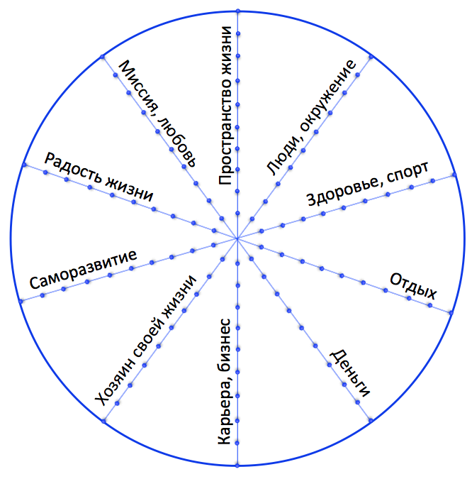 Как выглядит колесо жизни уже понятно – это круг, разделенный на восемь секторов. Но что делать дальше? Ничего сложного, все также легко и понятно. Каждую линию, отделяющую сегменты, необходимо разбить на 10 баллов от нуля до десяти.