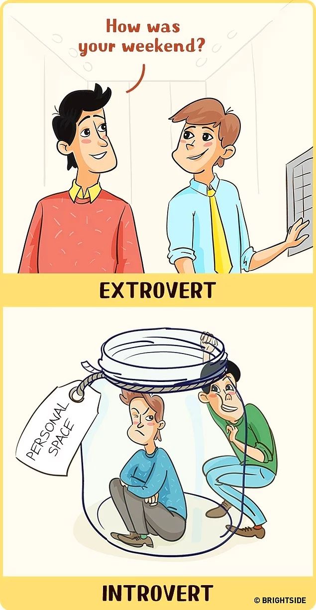 - Быть интровертом означает, что общение утомляет вас. Вы можете совсем не нервничать и не стесняться. На самом деле, многим интровертам нравится общение (если оно имеет смысл!). А некоторых даже неправильно идентифицируют как амбивертов или экстравертов. Но поскольку это в конце концов утомит вас, вы, вероятно, по возможности избегаете дополнительного времени на общение.