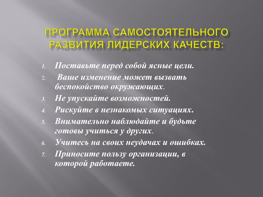 - ΠΡΡΡ Π»ΠΈΠ΄Π΅ΡΠΎΠΌ Π² ΡΠ²ΠΎΠ΅ΠΉ ΠΆΠΈΠ·Π½ΠΈ. Π‘ΠΏΠΎΡΠΎΠ±Π½ΠΎΡΡΡ ΡΠΏΡΠ°Π²Π»ΡΡΡ ΡΠ²ΠΎΠ΅ΠΉ ΠΆΠΈΠ·Π½ΡΡ, ΠΌΠΎΡΠΈΠ²ΠΈΡΠΎΠ²Π°Π½ΠΈΡ ΡΠ΅Π±Ρ, ΡΡΠ°Π²ΠΈΡΡ Π»ΠΈΡΠ½ΡΠ΅ ΡΠ΅Π»ΠΈ, ΠΏΡΠ΅Π΄ΠΏΡΠΈΠ½ΠΈΠΌΠ°Ρ Π½Π΅ΠΎΠ±Ρ ΠΎΠ΄ΠΈΠΌΡΠ΅ ΡΠ°Π³ΠΈ Π΄Π»Ρ ΠΈΡ Π΄ΠΎΡΡΠΈΠΆΠ΅Π½ΠΈΡ β ΠΏΠ΅ΡΠ²ΡΠΉ ΡΡΠ°ΠΏ ΡΠ°Π·Π²ΠΈΡΠΈΡ Π»ΠΈΠ΄Π΅ΡΡΡΠ²Π°. ΠΠΌΠ΅Π½Π½ΠΎ Π»ΠΈΠ΄Π΅ΡΡΠΊΠΈΠ΅ ΠΊΠ°ΡΠ΅ΡΡΠ²Π° ΠΏΡΠ΅Π΄ΡΡΠ°Π²Π»ΡΡΡ ΡΠΎΠ±ΠΎΠΉ ΡΡΠ½Π΄Π°ΠΌΠ΅Π½Ρ Π΄Π°Π»ΡΠ½Π΅ΠΉΡΠΈΡ Π΄Π΅ΠΉΡΡΠ²ΠΈΠΉ ΠΈ ΡΡΠΏΠ΅Ρ ΠΎΠ².