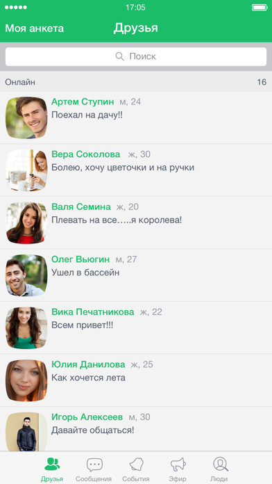 Контингент этого приложения во многом состоит из пользователей «Одноклассников». Средний возраст – за сорок, если ваш собеседник пишет без ошибок – это либо тролль, либо большая удача. Тем не менее, далекие от высоких технологий зрелые люди могут искать здесь друзей и любовь, чувствуя себя в безопасности. Модераторы стремительно вычищают все подозрительные аккаунты, онлайн не такой большой, зато география – широчайшая.