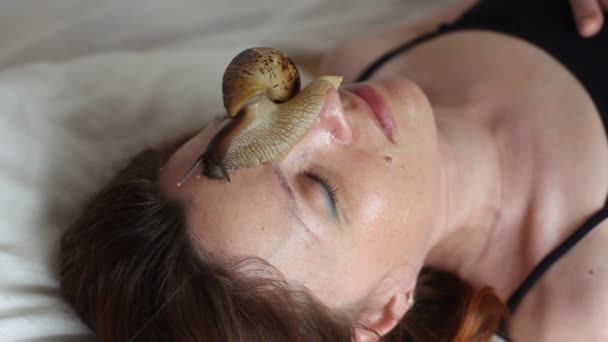 Две большие улитки на лице художника @AndriyASD 3840×2160 H.264 Кодирование видеофайла Без альфа-канала (25 кадров в секунду). #гламур #красота #кормление #крупный план #мужчина #уход #спа #очищение #мужской #массаж #кожа #гигиена #лицо #салон #ахатина. Молодая женщина в спа-салоне получает массаж лица улитками ахатинами. Улитки поедают омертвевшую кожу с произведенных. В итоге кожа становится гладкой и свежей.
