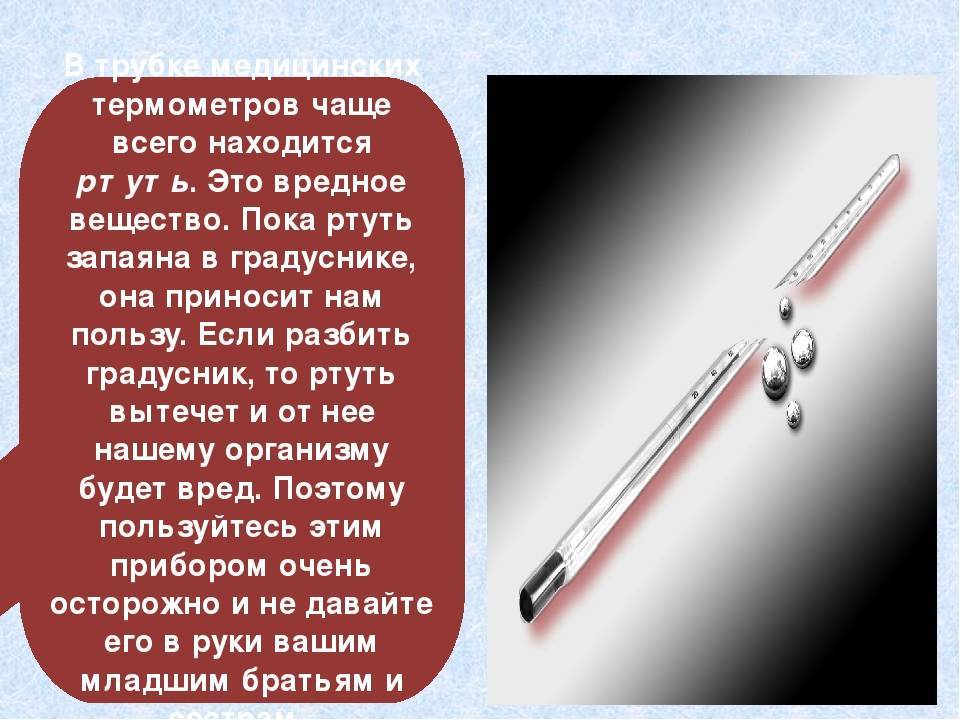 первое, что нужно помнить, если вы разбили ртутный термометр, это то, что серебристый вещество, содержащееся в этих стеклянных трубках, может быть очень токсичный. Конечно, определить, действительно ли в вашем градуснике ртуть. — важный шаг, однако всегда лучше перестраховаться, чем сожалеть.
