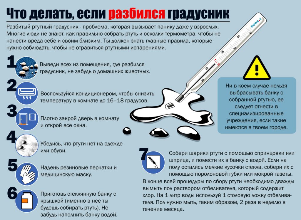 Что делать если разбился градусник? Прежде всего откройте окна на проветривание. Уберите жидкую ртуть в герметичный сосуд. Замойте место разлива реагентом для очистки. После уборки проверьте комнату тестом на ртуть. Пылесос для уборки категорически нельзя использовать.