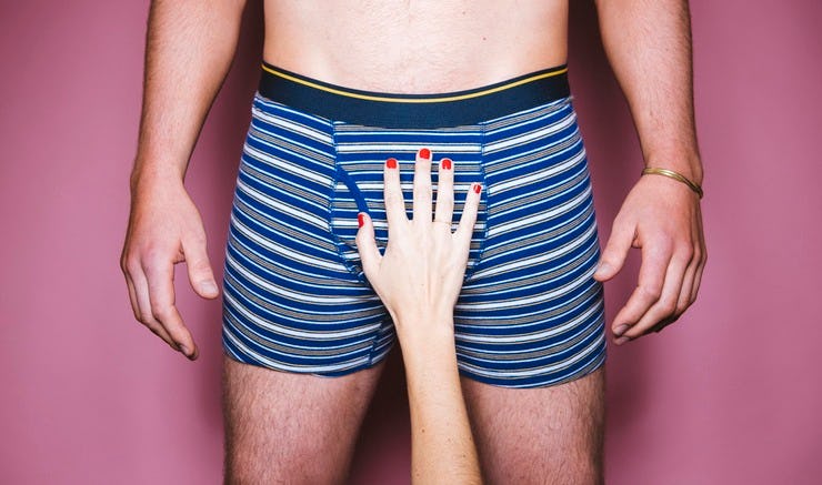Мужские яички, в виде куриных яиц, между ног парня в джинсах. ПРЕМИУМ