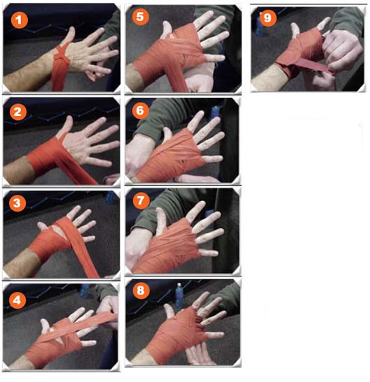 - Первый способ прямая намотка. Вся суть, которого заключается в постепенном и последовательном «обёртывании» руки от сустава запястья с переходом на обмотку всех пальцев в целом. При этом многие спортсмены используют 30 процентов пятиметрового бинта в качестве «дополнительной подушки» накладываемую на ударную поверхность и затем производят прямую фиксацию руки.