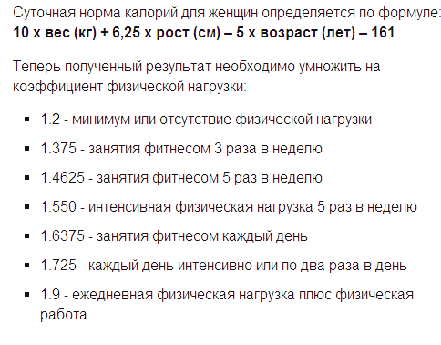 10 х вес (кг) + 6,25 х рост (см) – 5 х возраст (лет) – 161.
